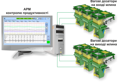 The system is designed for automatic control of mill productivity by flour grades according to the data obtained from the scales at the entrance and exit of the mill.